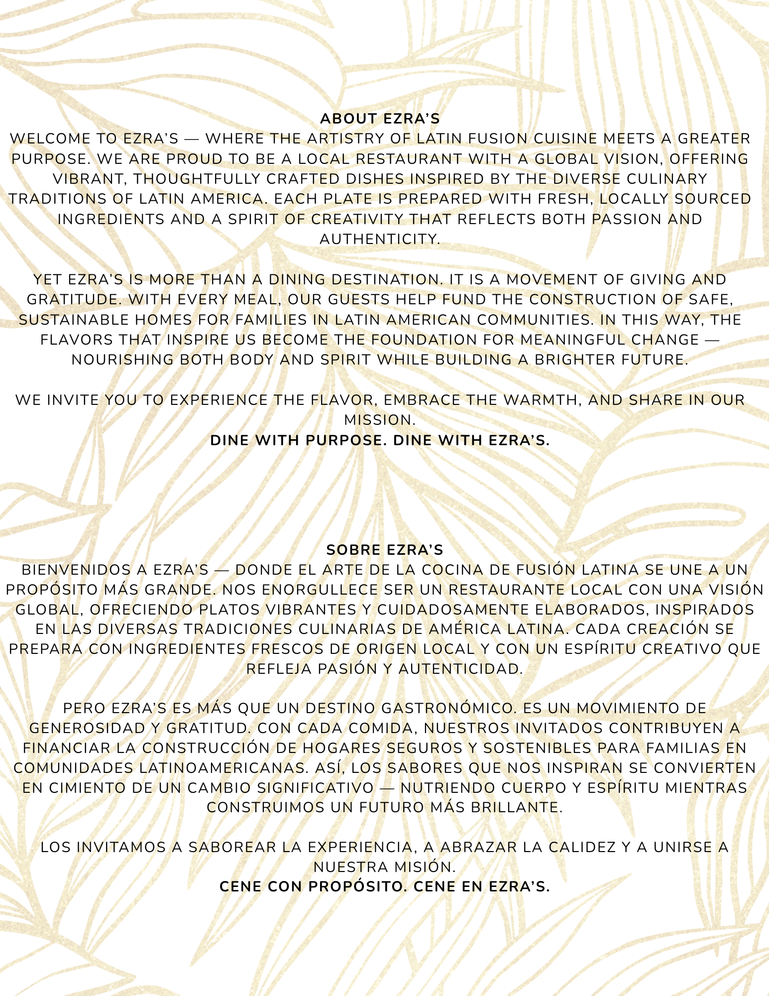 Whether you're joining us for brunch featuring items like guava eggs benedict and guava and cheese pancakes or indulging in our fine dinner service with favorites like crispy pork belly and golden tomahawk, every bite tells a story. We also offer convenient takeout options for those who want to enjoy Ezra's from the comfort of home. Our menu is rounded out with Latin-inspired desserts, house-made beverages, and irresistible bites like yuca croquettes, savory chicken bites, and creme brulee. Everything we create is prepared fresh using locally sourced ingredients and carefully crafted to deliver flavor, comfort, and a meaningful impact. At Ezra's, we're not just serving meals; we're serving a mission. Share the experience. Dine with purpose. Dine with Ezra's.